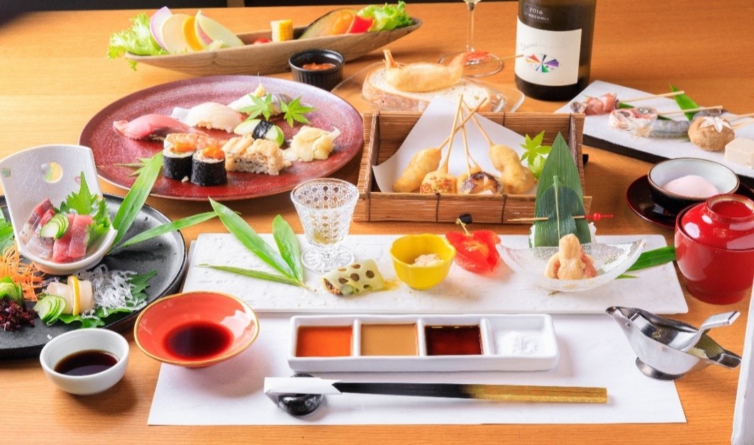 - ・前菜八寸 ・野菜盛り(肉味噌) ・季節のお造り ・串揚げ5本 ・鮨7貫 ・赤出汁 ・デザート ・1ドリンク(ソフトドリンク)