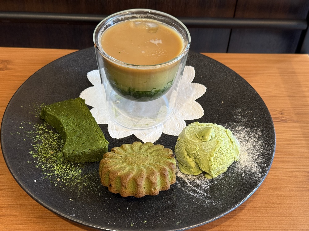 - 抹茶プレート・抹茶アイスラテ・抹茶のテリーヌ・抹茶のフィナンシェ・抹茶アイスクリームの抹茶づくしのプレート