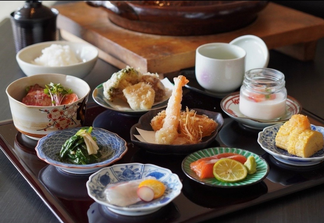- お付出し2種、スティック野菜、厳選食材天ぷら8品、ご飯又はお粥、味噌汁、漬物、デザート、ワンドリンク