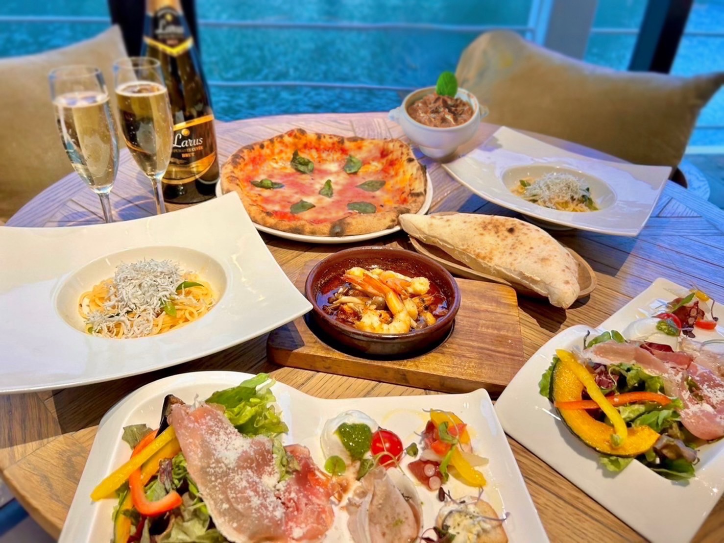 ・前菜4種とミニサラダ ・エビのアヒージョ ・パーネ