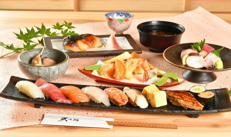 - ・突出し ・お造り5種盛り合わせ ・天ぷら盛り合わせ ・季節の焼魚 ・握り寿司10貫(握り8種、細巻き2種) ・赤出し ・デザート